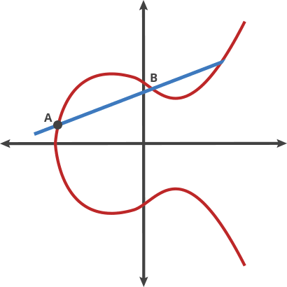 Let's imagine a simple game. We start at any point in the elliptic curve and consider any other point on the curve. If selected with care a line joining these 2 points will intersect the curve at point 3. Now this 3rd point is the dot product of these 2 points. Well not exactly, cause A ⋅ B = -C. We just reflect the point horizontally and get C. Now we just gotta do this operation again with A and C, and then repeat this finite many times. If we take the point A as the starting point and dot product it with itself, we'll get a tangent at that point. These are some properties of ecceptic curve, we'll dwell into them later.