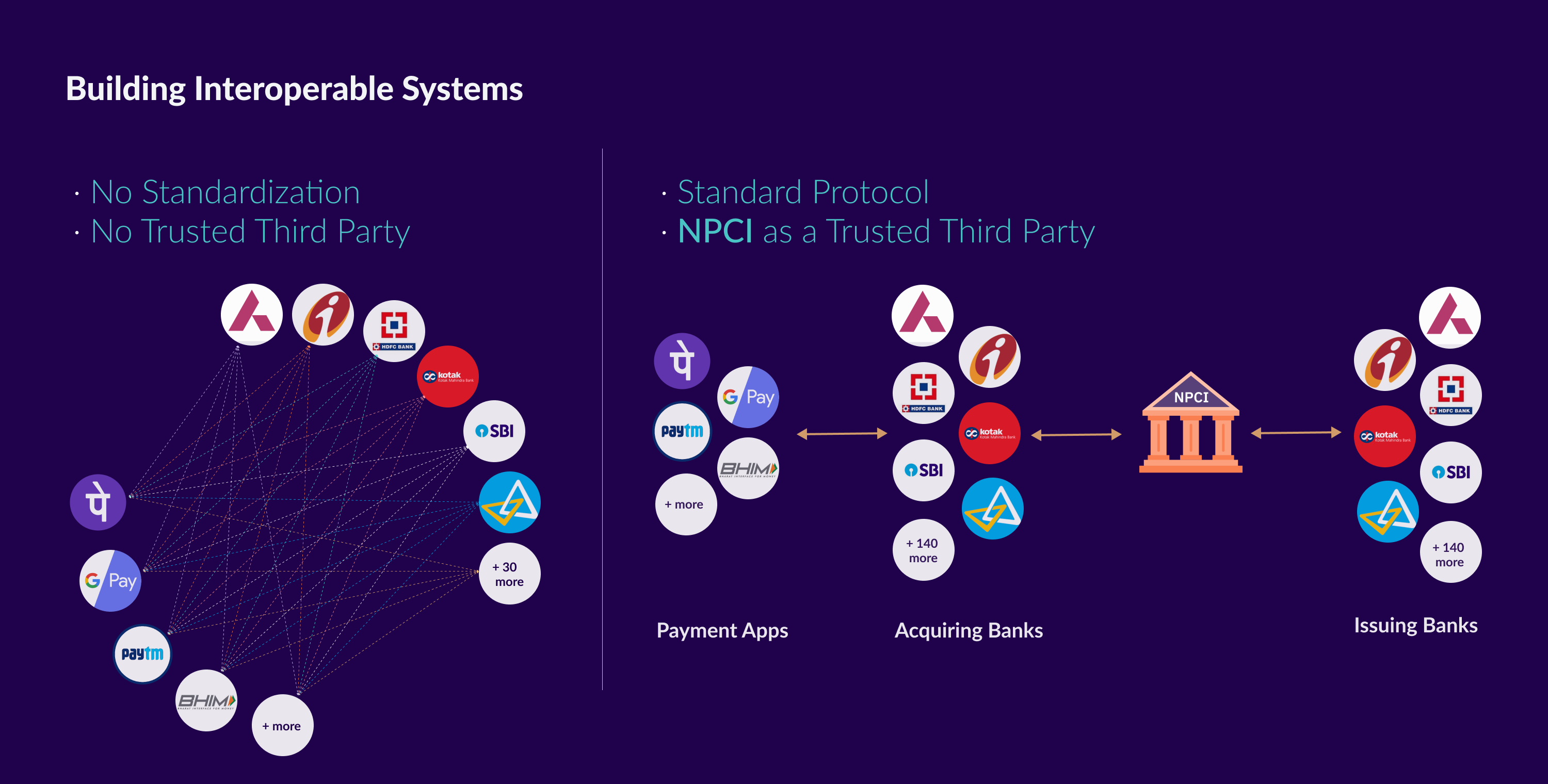 Connecting each payment app with each bank would be a crude method to create an interoperable network. It's a rather ineffective method of going about it, practically it is infeasible. To stop the ensuing chaos, we need a third party to regulate and standardize the interfaces.