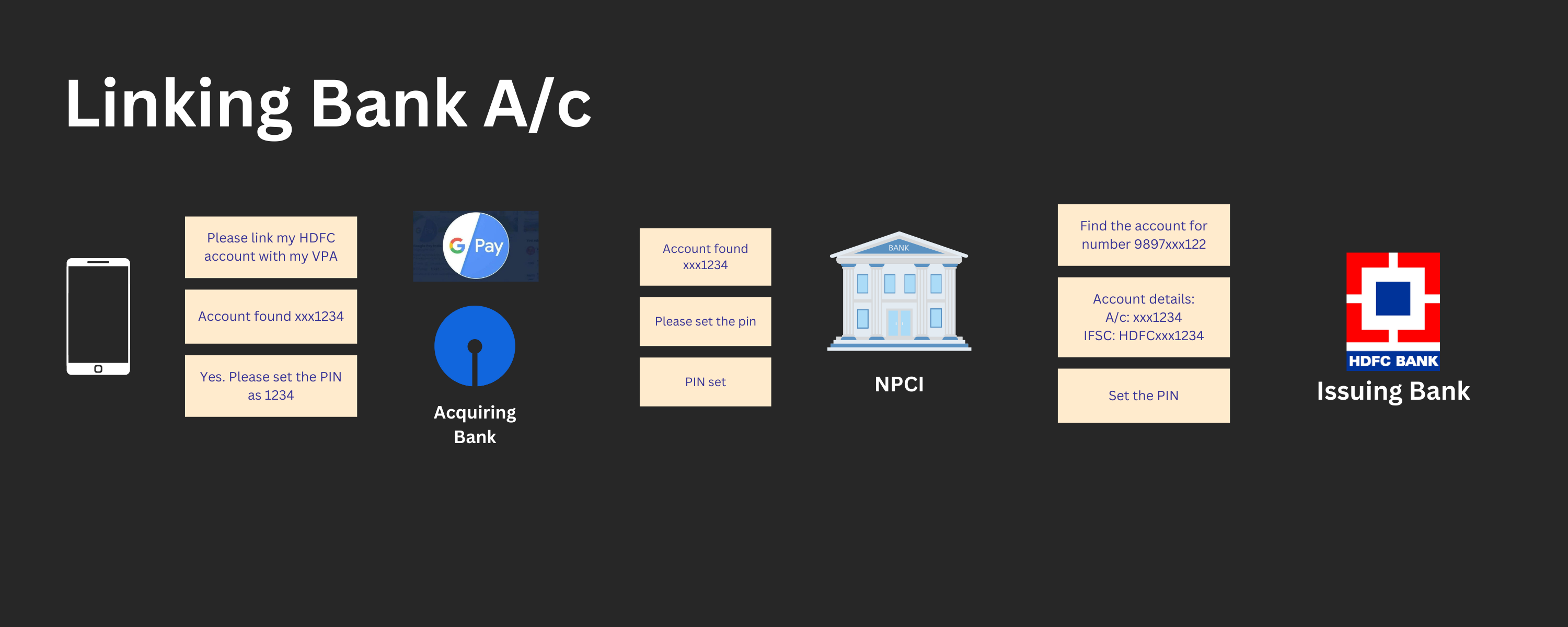 The Issuing Bank verifies the account's validity and returns the account details. When the Acquiring Banks get the account information, they update their database to link the newly formed UPI to the received bank account information.